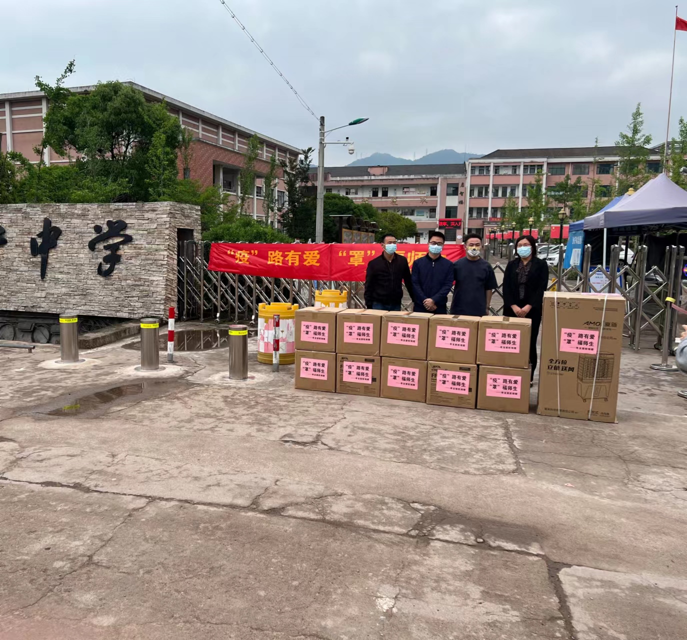 2022年4月29日上午,一輛4.2米紅色箱車滿載著愛心企業東陽市奇龍塑膠有限公司捐贈的一批防疫物資和學習用品,行駛到槐堂中學。